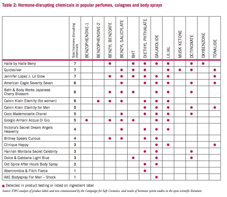 - Endocrine Disruption: Many of the chemicals used in perfumes can alter the endocrine system. A study that tested a range of 213 household and personal products found a number of endocrine-disrupting chemicals including BPA, phthalates, parabens and fragrances. In an analysis of 5 different types of phthalates in 47 brands of perfumes, researchers said they found ‘considerable amounts’ of phthalates in all brands, and a few had phthalate amounts that were above threshold limits.