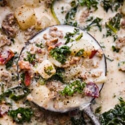 This Olive Garden copycat is a traffic superstar! Italian sausage, bacon, potatoes, and kale simmer together in a creamy broth for the ultimate cozy meal.