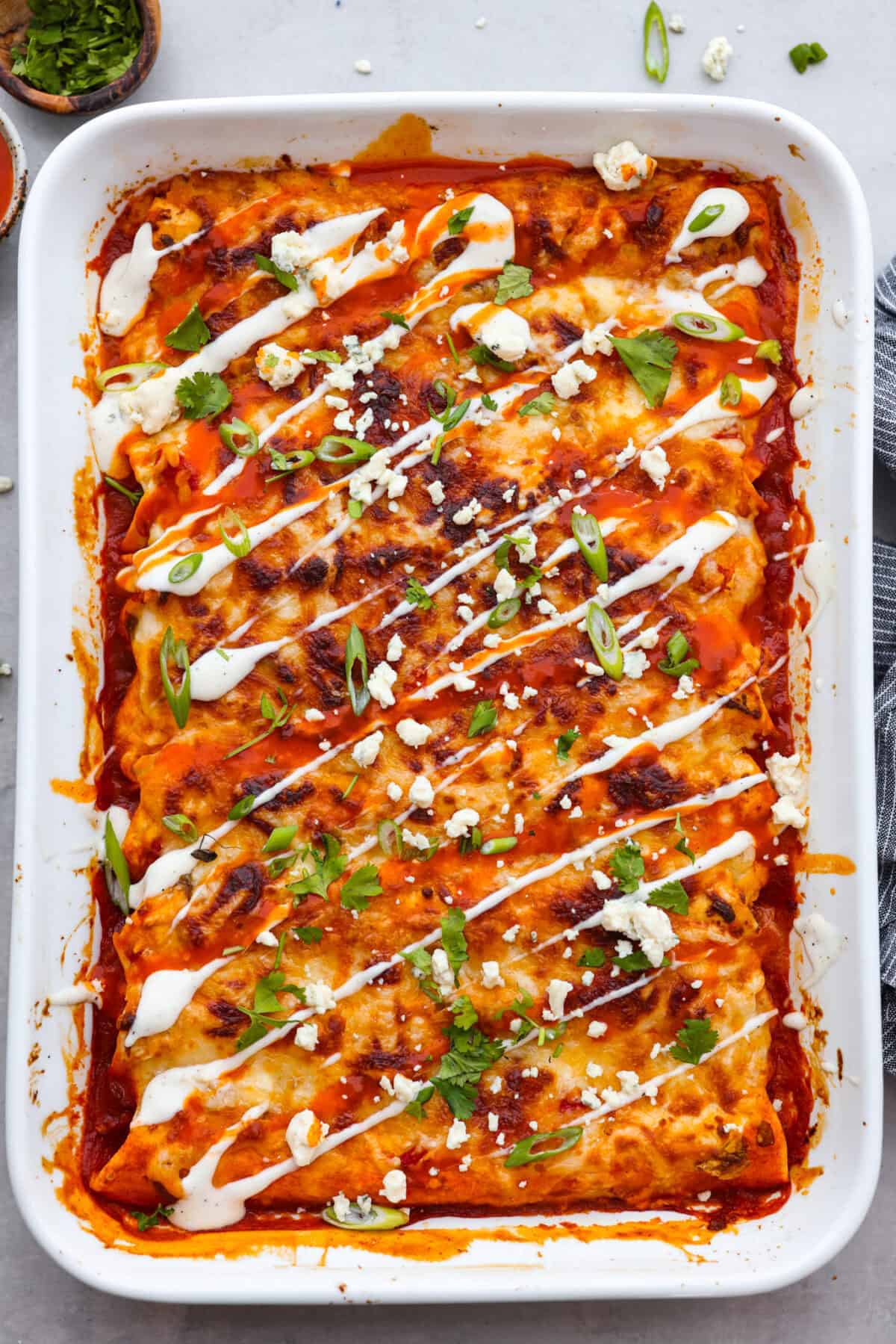 Stir in Chicken, Garnish, and Serve: Stir in cooked, shredded chicken. Garnish with a crumble of blue cheese and chopped green onion if desired.