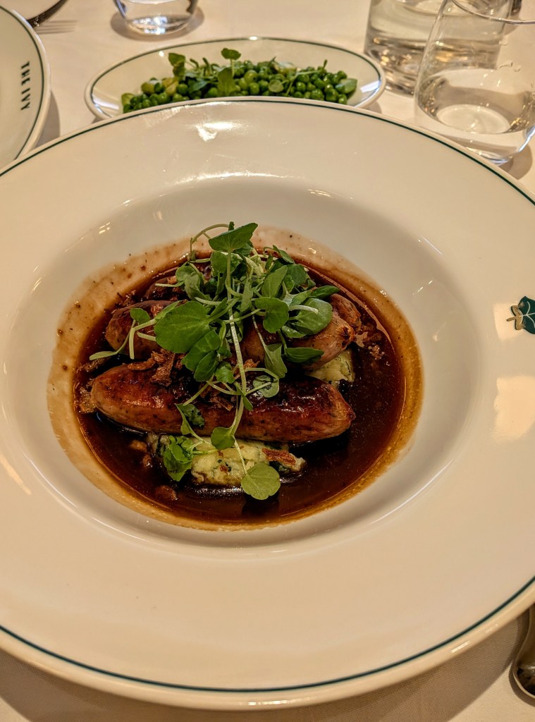 I wanted a hearty feed for my main course, so the Cumberland sausage and mash seemed fitting. The bangers were as flavourful and peppery as one would hope. Quite why a ‘truffled red wine sauce’ was necessary I’m not sure as the truffle flavour wasn’t really in harmony with everything else but the gravy generally had a nice depth and consistency. Mash was suitably luxurious but not overly decadent, could easily have been smoother with more butter to some peoples tastes. There might have been more of it for some peoples tastes. I wasted an extra £5.25 on a side of peas and broad beans that was literally just some frozen peas and beans. I’m not sure what I expected though, a lardon amongst it all? I will say the sea bream enjoyed by my friend looked particularly good for lunch menu standards. He gave it a firm thumbs up, though if you were hungry you’d need to order your carbs separately.