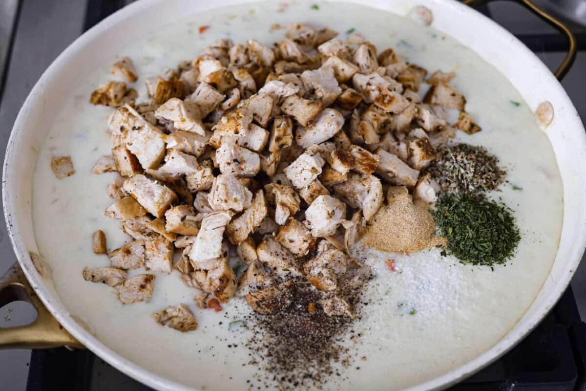 Stir in the 3 cups cooked and chopped chicken, 1 teaspoon garlic powder, 1 teaspoon dried parsley, ½ teaspoon dried basil, and salt and pepper to taste.