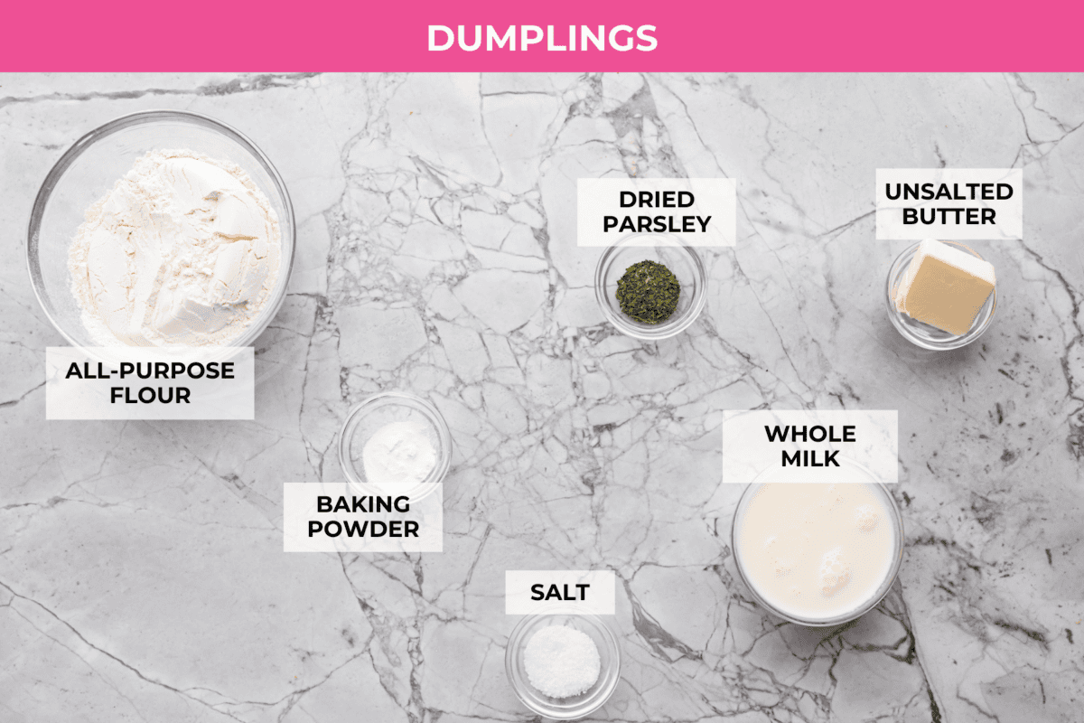 Make the Dumplings: In a bowl, whisk together the all-purpose flour, baking powder, salt, and dried parsley. Using a pastry blender or fork, cut the cold, cubed unsalted butter into the flour mixture until mixed in.
