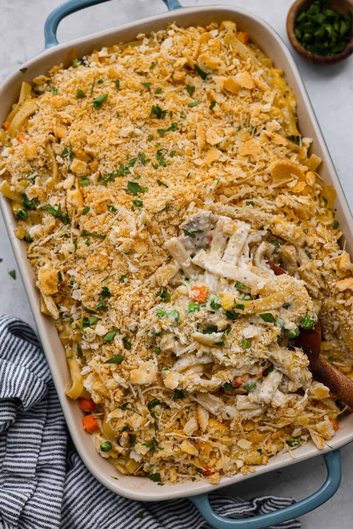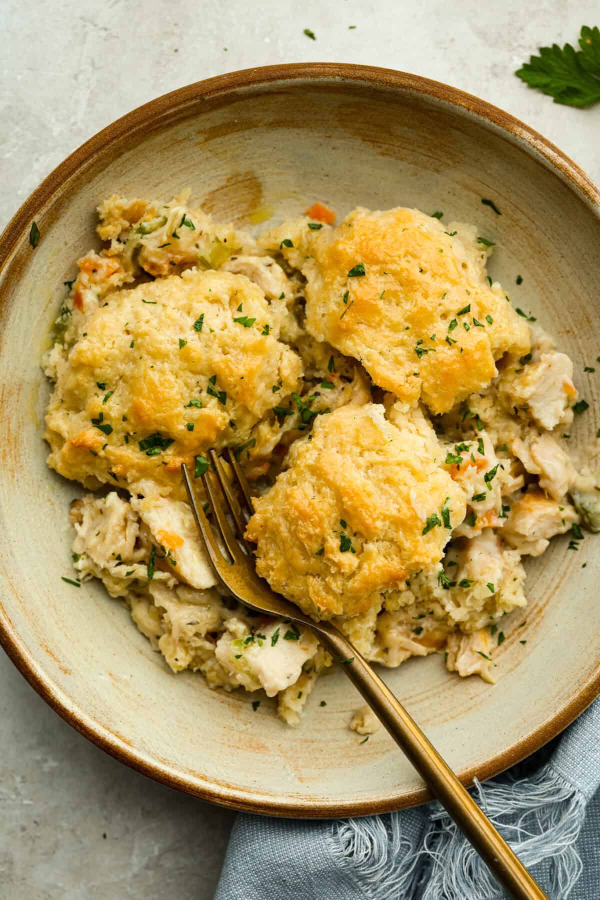All the cozy flavors of chicken and dumplings in an easy to make casserole. It’s a complete dinner all on its own, but feel free to add a fresh green salad on the side!