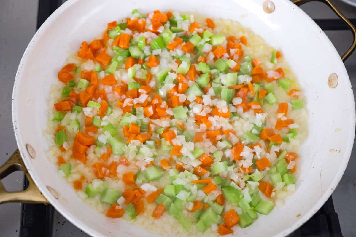 In a large skillet melt the ¼ cup unsalted butter over medium-high heat. Add the 1 cup minced yellow onion, 2 ribs chopped celery, and 2 peeled and chopped carrots to the pan and cook, stirring frequently, until the vegetables are tender. About 3-5 minutes.
