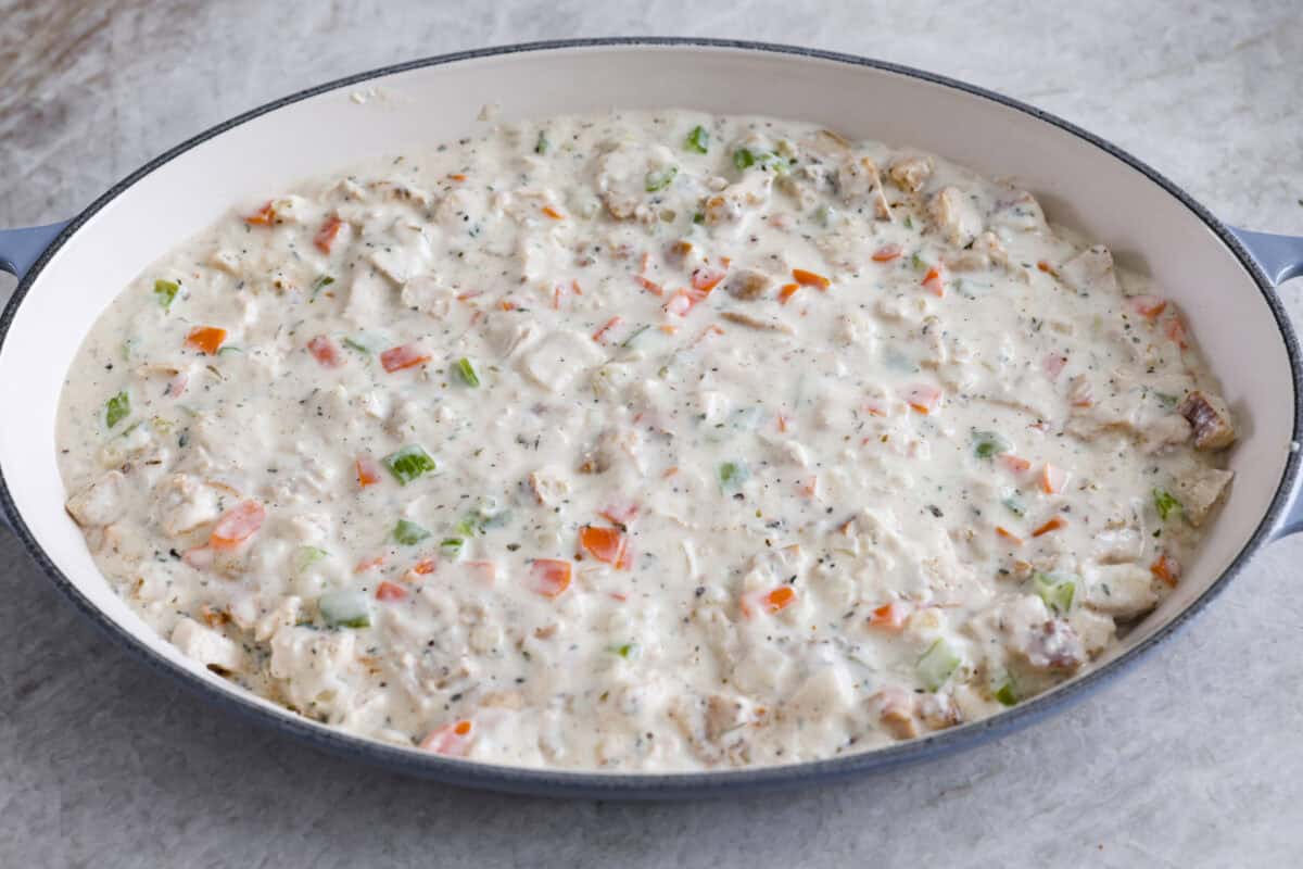 Add Dumplings to the Top: Pour the whole milk into the mixture to bring the dough together. Drop spoonfuls of the dumpling dough evenly over the chicken and vegetables.