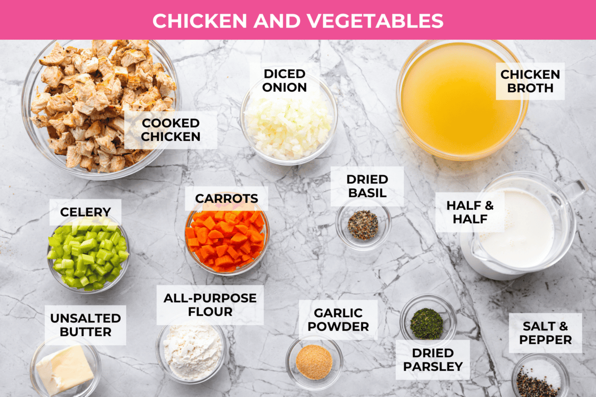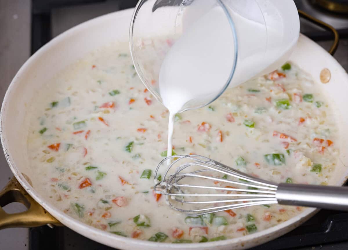 Make the Sauce: Whisk the all-purpose flour into the vegetable mixture. Then, slowly whisk in the chicken broth and half and half. A gravy should form as you whisk in the liquid.