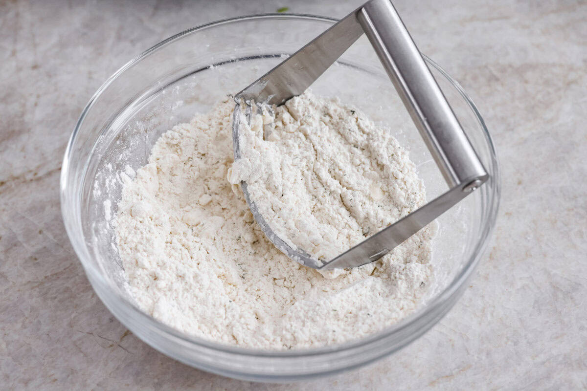 In a bowl, whisk together the 1 ½ cups all-purpose flour, 1 ½ teaspoons baking powder, 1 ½ teaspoons salt, and 1 ½ teaspoons dried parsley. Using a pastry blender or fork, cut the ¼ cup cold, cubed unsalted butter into the flour mixture until it’s evenly distributed.
