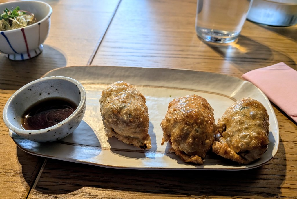 The starters are a small section, entirely between dumplings and small salads. I opted for prawn dumplings that were little homemade, fried gyoza. They were charmingly irregular and bursting at the seams. Crispy with plenty of the delicious seafood filling along with a simple soy-based dipping sauce. My vegan friends enjoyed some onigiri with interesting fillings and toppings.