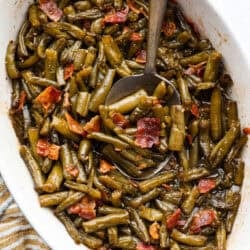 Crack green beans are the side dish that guarantees seconds! Tender green beans bake in a sweet-savory buttery sauce with smoky bacon. These are simple to make, wildly addictive, and gone in minutes.
