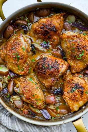 • Make ahead: Chop the veggies and season the chicken a few hours ahead. Refrigerate the seasoned chicken, skin-side up, uncovered, to dry the skin for a crisp sear. Let the chicken sit at room temperature for 1 hour before cooking.