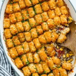 Cowboy Casserole is creamy, cheesy, and topped with crispy tater tots. A hearty, budget-friendly dinner that’s kid-approved and weeknight easy.