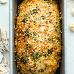 Juicy ground chicken mixed with garlic, herbs, and parmesan, then baked with a crispy parmesan crust for a flavorful twist on classic meatloaf.