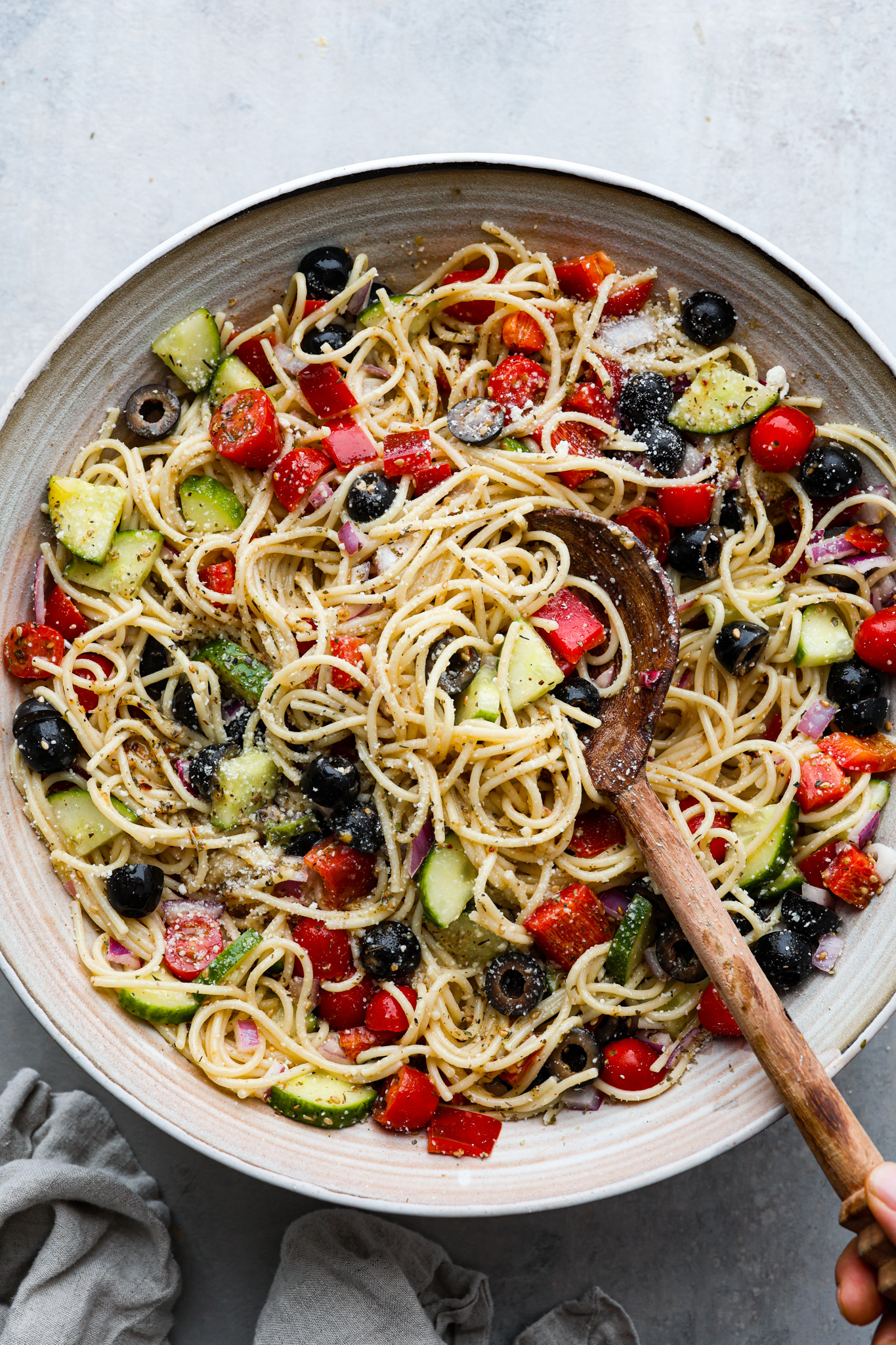 Add the dressing to the pasta bowl and mix until evenly combined. Taste and adjust seasonings as needed. Refrigerate until ready to serve or serve immediately.
